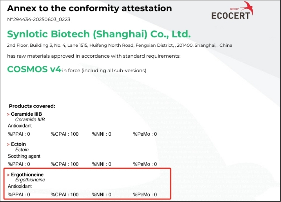 Shanghai Yunluo: Ergothione on saanut COSMOS-sertifioinnin